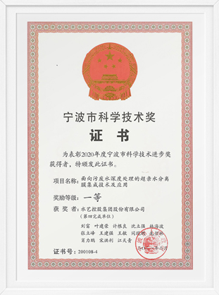 甯波市科學技術獎證書-面向污廢水深度處理的超親水分離膜集成技術及應用(水藝控股集團)